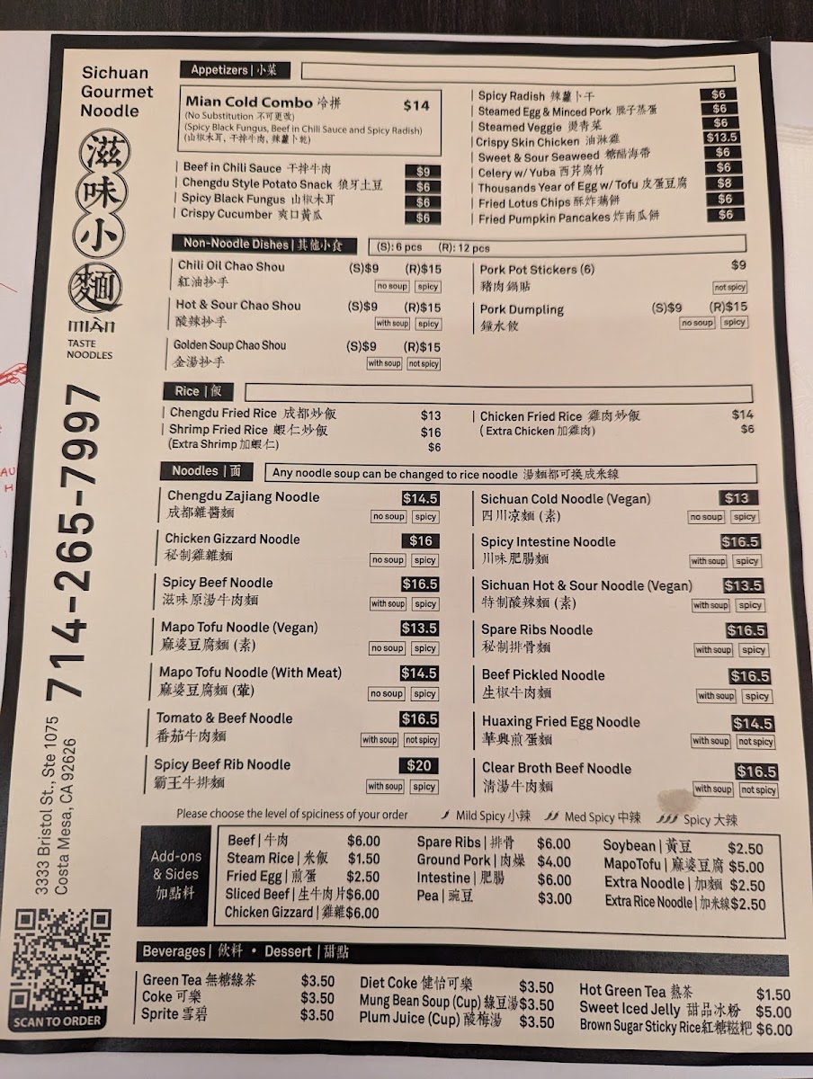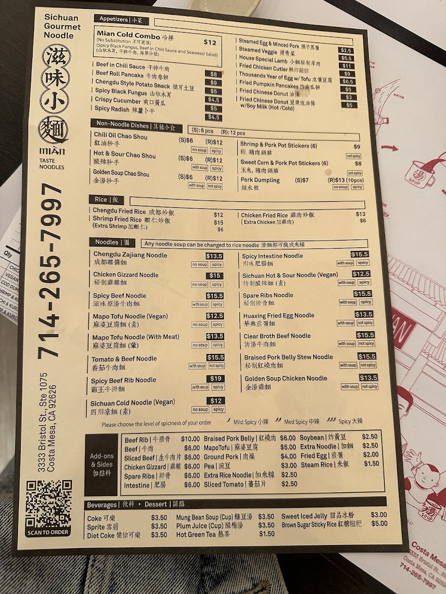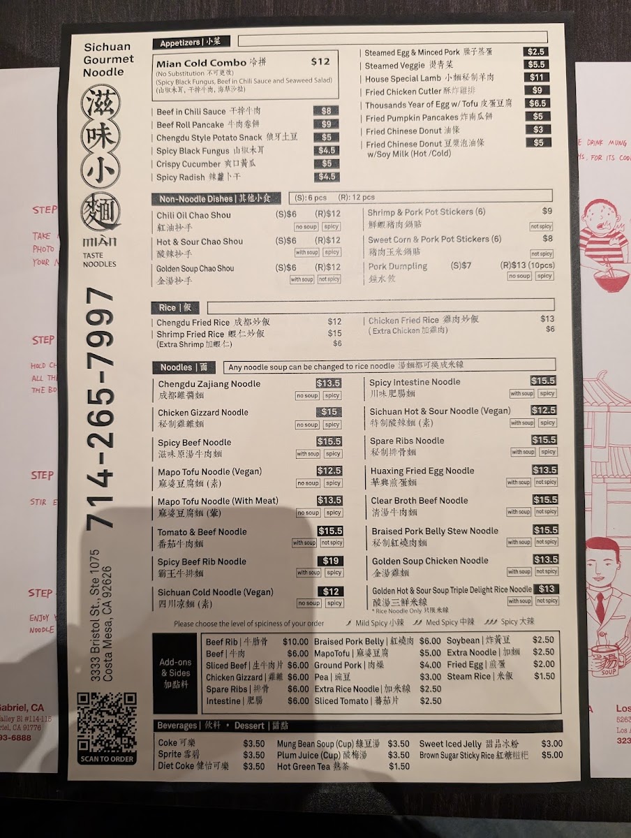 The noodle and rice noodle sections showcase Mian's culinary expertise, with signature dishes like Spicy Beef Soup Noodles and Mapo Tofu Noodles Vegan, catering to both meat lovers and vegetarians. The Chengdu Zajiang Noodles and Golden Soup Chicken Noodles are also crowd favorites, offering rich and satisfying broths. For rice noodle enthusiasts, the Spicy Beef Rice Noodles and Clear Broth Beef Rice Noodles provide a satisfying, comforting experience.