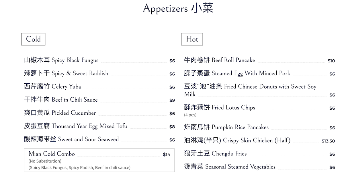 Mian Sichuan Gourmet Noodles offers a diverse and flavorful menu that captures the essence of Sichuan cuisine, with a variety of options ranging from appetizers to desserts. For those looking for a complete meal, the Mian Special Combo is a standout, available in two versions: $25.99 and $20.99, offering a well-rounded selection of dishes that highlight the restaurant's specialties.